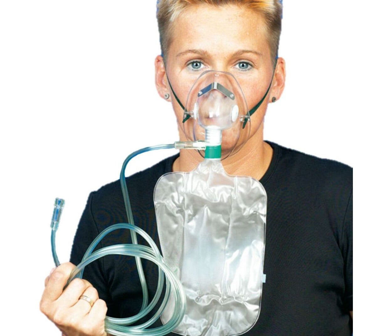 Met reservoirtas, 2,10 m veiligheidsslang, neusklem en bevestigingsriem.